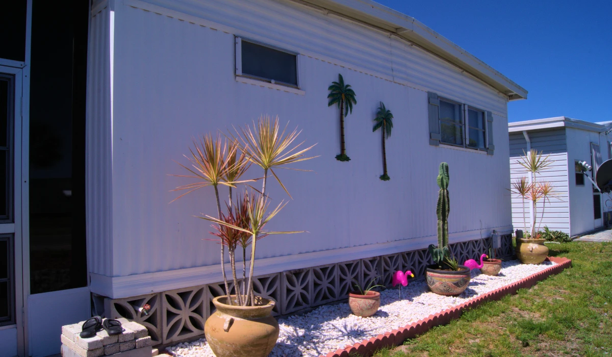 Mobile homes, manufactured houses, trailers, double-wide units, RV-style residences, and shared community facilities such as clubhouses, laundry rooms, and park offices.